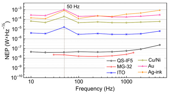 Using monochromatic radiation of the NovoFEL at four different wavenumbers, the corresponding NEPs at 500 Hz (QS-IF5, ITO, Cu/Ni, Au), 250 Hz (MG-32), or 20 Hz (Ag-ink) were determined for all the pyroelectric transducers studied. The exact frequency was chosen based on the response of the detectors (see Section 3.2). The data obtained for all considered detectors are summarized in Table 2.
