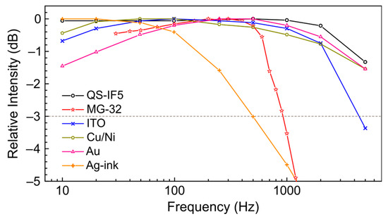 Figure 4 shows the frequency response of the transducers measured at 66.7 cm−1 (150 μm; 2.0 THz) in the range of 10–5000 Hz. Relevant information about the resistance and capacitance in the preamplifier feedback is given in Table 1. Let us firstly discuss the high frequency part of the response. The MG-32 shows a significant signal drop above 700 Hz that is caused by the RC of the preamplifier feedback. In contrast, the ITO and Ag-ink detector signal fall off is controlled by the intrinsic temporal response of the films and their coatings. The behavior of the other detectors, namely QS-IF5, Cu/Ni, Au, is somewhat more confusing, since their frequency characteristics are comparable to both RC and the rise and decay times of the NovoFEL radiation caused by its optical resonator. In the case of reduced resistance in the preamplifier feedback, the QS-IF5 allows the detection of a fine structure of the NovoFEL macropulses, as shown in Figure S15 of the Supplementary Material. In contrast, the Cu/Ni and Au detectors demonstrate almost the same behavior as was detected with 100 MΩ resistance. This means that their frequency response is governed by their intrinsic temporal response, while for the QS-IF5 it is limited by the RC of the preamplifier feedback. The temporal response of the detectors, if has been observed, correlates with the total thickness of the sensitive area and electrodes. The thinner the film and the electrodes, see Table 1, the faster the temporal response and the wider the detector bandwidth. The time profiles of the NovoFEL macropulses obtained by all detectors are given in Figures S15–S17 of the Supplementary Material.