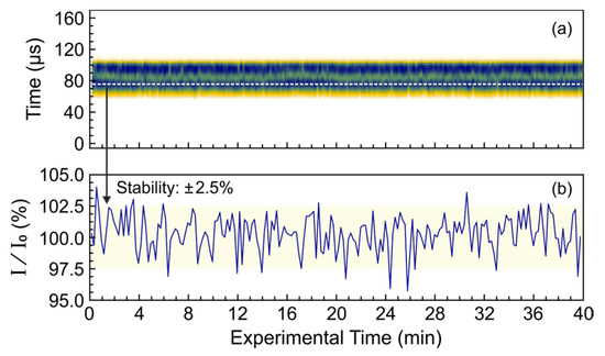 According to Figure 6b, the NovoFEL is capable of generating stable macropulses during a fairly long 40 min experiment. The maximum variation in THz power during the experiment is ±2.5%, which is comparable with the detector noise. There is also no significant horizontal jitter (see Figure 6a) that is even more important for experimentalists because it cannot be easily corrected, but can significantly distort the results of time-resolved experiments. Because of the high duty cycle (500–10,000) typically used at the EPR endstation, the entire time profiles of the macropulses are recorded with the oscilloscope instead of using lock-in detection.