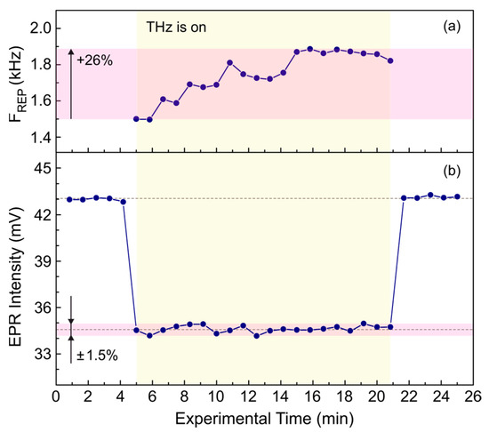 (a) Adjustment of the repetition rate of the THz macropulses used in the experiment. Macropulses with a duration of 100 μs and a wavenumber of 1118 cm−1 (8.95 μm; 33.5 THz) were measured by the QS-IF5 detector in parallel with the experiment. The repetition rate was varied to have the same integral intensity of the macropulse. (b) Stability of the EPR signal resulting from the influence of the THz macropulses after adjustment of the repetition rate.