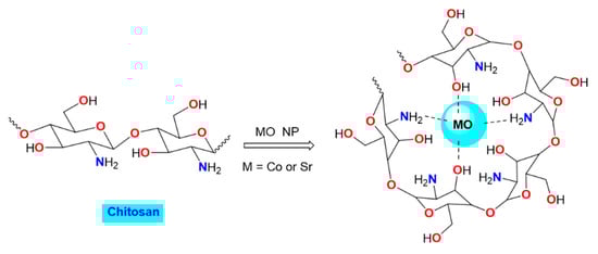 The chitosan-metal oxide (CoO or SrO) nanocomposite in a simplified viewpoint.