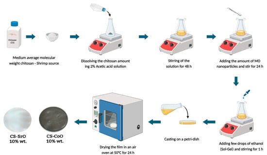 The synthesis of the chitosan-metal oxide (CS/CoO or CS/SrO) nanocomposite films was carried out using the sol-gel approach [,]. A 2% weight chitosan solution was created by dissolving 1 g of chitosan in 50 milliliters of a 2% weight/volume aqueous acetic acid solution. The dissolution process involved continuous stirring at room temperature for a duration of 48 h. The viscous solution was filtered using a 90 mm Whatman filter paper in order to obtain a homogeneous and transparent chitosan solution. A fraction of the solution was transferred into a 50 mL vial, where 5 (w/v%) quantities of metal oxide (either CoO or SrO) were incrementally added. The resulting combination was then violently agitated for an extra duration of 24 h. A precise volume of ethanol (0.5 mL) was introduced into the system to facilitate the sol-gel process while being subjected to continuous stirring for an additional duration of 1 h. In order to facilitate the evaporation of the solvent, the solution was introduced into a Teflon Petri dish with a diameter of 8 cm. Subsequently, the solution was subjected to a drying process for a duration of three days within a vacuum oven operating at a temperature of 50 °C. Following the neutralization process with 5 mL of 1 M KOH and subsequent removal from the Petri plate, the chitosan-MO nanocomposite film was immersed in distilled water. The film was thereafter placed in a vacuum desiccator at room temperature for a duration of two days. Figure 2 shows a block drawing for the sample preparation.
