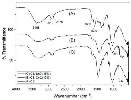 In Figure 3, a comparative FTIR analysis of native chitosan (A), chitosan-cobalt oxide (B), and chitosan-strontium oxide (C) nanocomposite is shown. Due to the overlapped stretching bands for -OH and -NH2, that are located in the same region, the chitosan spectrum (A) revealed a large stretching band at υ = 3408 cm−1 [,,]. Additionally, the typical chitosan characteristic bands (amide group band for CONH) developed at υ = 1658 and 1609 cm−1, and those of aliphatic CH emerged at υ = 2918 and 2875 cm−1.