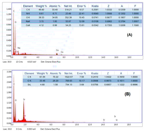 In order to estimate the amount of metal in the chitosan, Figure 5A exhibits the EDS of the chitosan-CoO nanocomposites, where the hybrid material’s EDS confirmed the appearance of the standard Co signals, and the Co content was 4.12 wt.%, as seen in Figure 5. The chitosan-SrO nanocomposites’ EDS graph in Figure 5B displays the appearance of typical Sr signals; the materials’ Sr concentration was 4.68 weight percent. The existence of the typical Co and Sr signals is evident from the EDX tests, which strongly supports their inclusion into the chitosan matrix.
