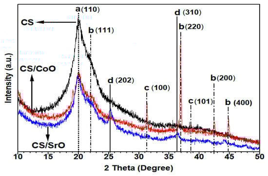 X-ray diffraction (XRD) has been employed as a technique to investigate the level of crystallinity and the nanostructural characteristics of both the pristine chitosan material and the thin films composed of modified chitosan incorporating 5 wt.% CoO and 5 wt.% SrO nanoparticles. The XRD pattern of unmodified chitosan, as depicted in Figure 6, displays a distinct diffraction peak (a) at an angle of 20.8°. This peak is ascribed to the presence of (110) crystallographic planes inside the chitosan structure [,]. The existence of both crystalline and amorphous components of chitosan is indicated by this diffraction peak, as reported in the literature [,,]. Moreover, the presence of certain chitosan impurities was revealed by the appearance of supplementary peaks in the X-ray diffraction (XRD) pattern. The characteristic peak of chitosan (a) was observed in the diffraction patterns of both the CS-CoO and CS-SrO nanocomposites at an identical angle of 20°. The absence of any shift in the peak position between undoped chitosan and doped chitosan suggests that the cubic CoO and SrO nanocrystals that were synthesized do not exhibit any additional strain. This observation was also noted by Deori and Deka []. Furthermore, the XRD technique was employed to ascertain the crystal structure of the synthesized CS-CoO. The diffractogram is also depicted in Figure 6. The CoO nanoparticles exhibit distinct peaks at 2θ = 22.03°, 36.80°, 42.46°, and 44.9° corresponding to the crystallographic planes (111), (220), (200), and (400) as shown on the JCPDS card no. 73-1701 []. The XRD analysis indicated the existence of CoO crystals within the produced nanoparticles. Nevertheless, an alternative phase, specifically β-Co(OH)2 (JCPDS card #30-443), has been seen at angles of 2θ = 31.4°and 36.80°, denoted by their corresponding Miller indices, (100) and (101) []. This finding is consistent with a prior study conducted by Sun et al. []. Furthermore, the absence of impurity diffraction peaks suggests that the Co-precursor has undergone complete transformation into its oxide forms. The XRD pattern did not exhibit the presence of any further phases, such as Co3O4 (JCPDS card #42-1467) or metallic cobalt (Co, JCPDS #05-0727). The nanocomposite film, consisting of a crystal phase produced with 5 wt.% CS-SrO, was successfully detected using X-ray diffraction measurement. The XRD pattern of strontium oxide nanoparticles is also illustrated in Figure 6. The diffraction peaks exhibit a high level of concordance with the standard data for strontium oxide as documented in the JCPDS card No. 01-1113. The Bragg peaks are seen at the angles of 2θ = 25.19° and 36.37°, corresponding to the crystallographic indices (202) and (310), respectively [].