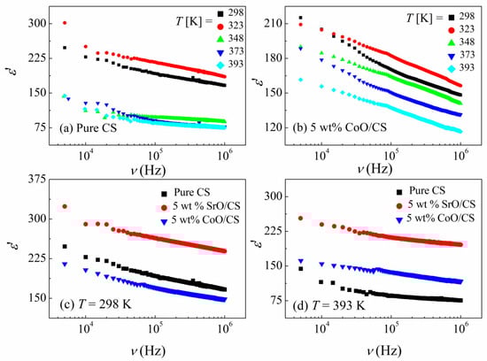 The dielectric response to the applied electric field can be due to several processes such as the relaxation processes from the molecular fluctuations of dipoles, the conduction process from the propagation of charge carriers, and the interfacial (or Maxwell/Wagner/Sillars (MWS)) polarization in multiphase systems due to the blocking of charge carriers at the interfaces of the different phases []. In the present paper, we characterized the dielectric properties in terms of the real (ε′), named dielectric constant, and the imaginary (ε″), named dielectric loss, parts of the complex dielectric permittivity ε* as a function of frequency to explore the effect of CoO and SrO nanoparticles on the dipolar relaxation and the electrical conduction processes of CS for electrical applications, e.g., in energy storage devices. Figure 6a,b, shows the dielectric constant as a function of frequency, ε′ (υ), at various temperatures for pure CS and CoO/CS samples, while Figure 7c,d illustrates the ε′ (υ) spectra for CS, CoO/CS, and SrO/CS nanocomposites at 298 K and 393 K, respectively.