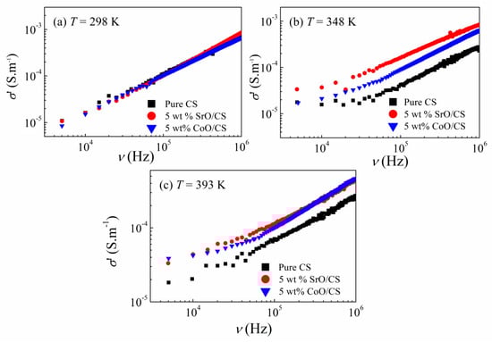 The real part of the complex ac conductivity, σ′ (ν), was calculated using the relation: σ′ = ε″ εₒ ω, where εₒ is the permittivity of free space and ω is the angular frequency (ω = 2πν). Figure 9 depicts the frequency response of the conductivity, σ′ (ν), for the pure CS and CoO, SrO/CS nanocomposites at different temperatures.