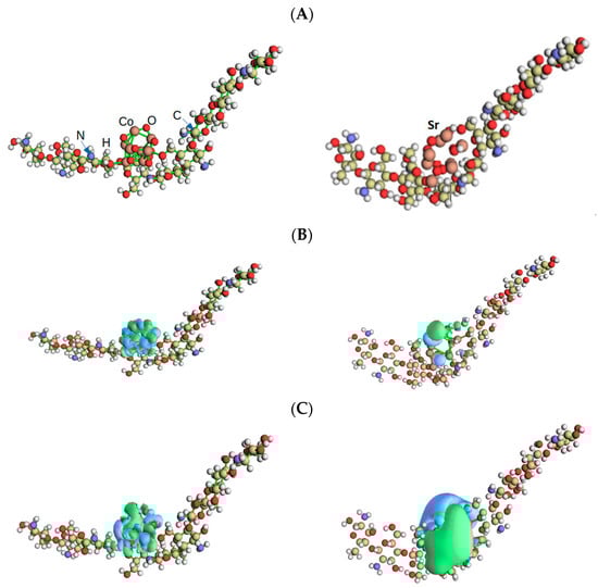 The binding energies, Eb = Ecombind − (EChitosan + Enano), were estimated as −9.2 eV and −8.1 eV, respectively, for the compound’s CoO/chitosan and SrO/chitosan, where Ecombind is the compound’s total energy, Echitosan is the chitosan’s energy, and Enano is the energy for the nano-cluster (Co4O4, or Sr4O4). The negative Eb indicates the stability of the compounds. Figure 10A shows the geometrically optimized structure for the compounds where the HOMO (Highest Occupied Molecular Orbital) and LUMO (Lowest Occupied Molecular orbitals) iso-surfaces are shown in Figure 10B,C, respectively. These orbitals are mainly localized around nano-clusters, suggesting the chemical stability of the CoO/chitosan structure. The nearly spherical spreading of the HOMO and LUMO around CoO nano-cluster (left panels of Figure 6b,c) may be associated with the filling of the distributed and orientated components of the d-orbitals of the Co transition metal. On the other hand, the HOMO and LUMO exhibit different profiles around the SrO nano-clusters (right panels of Figure 6b,c) which may be due to the Alkaline, s-block nature of the Sr metal.