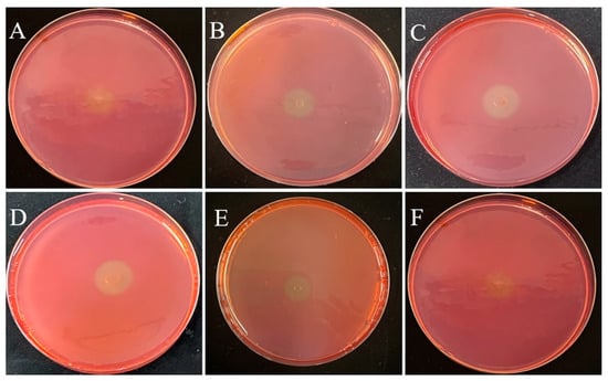 Silkworm excrement samples (5 g) were weighed and added to 100 mL of CMC liquid medium with CMC-Na as the only carbon source []. The enrichment culture was placed in a shaker at 30 °C and 180 rpm for 30 min, after which approximately 4 mL of the mixture was transferred to a flask containing fresh medium and shaken for a further 72 h. After performing enrichment culture three times, the bacterial solution was diluted to 10−3, 10−4, and 10−5. The samples were plated on LB agar plates at 30 °C for 72 h, and colonies with different phenotypes (size, color, and shape) were isolated []. Ten-fold dilutions of the suspension of well-isolated colonies were spread on CMC-Congo red plates and incubated at 30 °C for 48 h. The hydrolyzing capacity (HC) of the cellulose Congo red agar was calculated from the ratio of the halo band to bacterial colony diameter (D/d). The hydrolytic activity of each isolate was determined based on the HC value [].