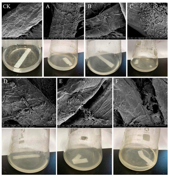 The filter paper disintegration test was used as a verification method for the rescreening of cellulolytic bacteria to observe the disintegration ability of the strains on filter paper []. The spore suspension of the primary screening strain was centrifuged and washed twice with 1× M9 buffer and then inoculated into the medium with filter paper (starch-free filter paper, 2 × 5 cm, three samples per bottle) as the only carbon source. Inactivated bacterial solution that was prepared via high temperature and high pressure was added as the control group (CG), and the culture was incubated in a shaker at 37 °C and 200 rpm for 72 h. The disintegration of the filter paper was observed and recorded every 24 h []. The decomposed filter paper of the experimental group and the completely intact filter paper of the CG were removed with tweezers and sampled with the ethanol gradient dehydration method that involved dehydration with ethanol using a gradually increasing concentration gradient (20% volume fraction gradually increased to 100%). The dehydration time decreased with increasing volume, from 30 min to 3–4 min. Finally, after freeze-drying for 24 h, the filter paper was sprayed with gold for sample preparation []. The surface morphology of the filter paper was observed with field emission scanning electron microscopy (FE-SEM S-4800, Hitachi, Tokyo, Japan). Finally, strains with high cellulolytic index and those with clear disintegration of the filter paper were selected for purification [].