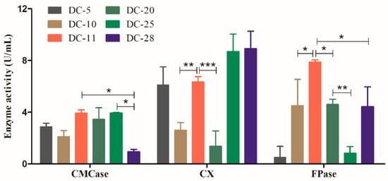 To further identify the bacterial isolates with the strongest cellulolytic ability, the cellulase activities of the six strains were measured. Cellulase assays were performed based on the ability of the individual isolates to hydrolyze cellulose to reducing sugars. In this study, the activities of the three cellulases were determined using the DNS assay method. As shown in Figure 3, CMCase and FPase activities of DC-11 were significantly higher than those of other strains (p < 0.05). The CXase activity of DC-11 was significantly higher than those of DC-10 and DC-20 (p < 0.01), but did not differ significantly from those of DC-5, DC-25, and DC-28. The CMCase and CXase activities of DC-11 reached 3.26 ± 0.59 and 6.33 ± 0.61 U/mL, respectively, and its FPase activity was as high as 7.87 ± 0.25 U/mL. The above results show that DC-11 has the strongest cellulase-producing ability among the newly isolated strains and can efficiently degrade cellulose.