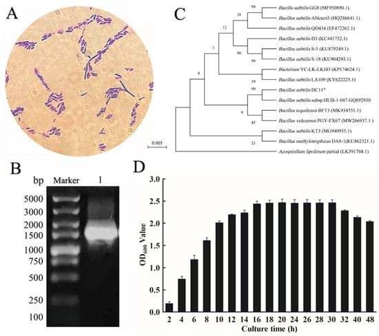 Identification of strain DC-11. Gram staining (A), phylogenetic tree (B), agarose gel electrophoresis of 16S rDNA (C), and growth curve (D) of strain DC-11. *: Isolated DC-11 in this study.