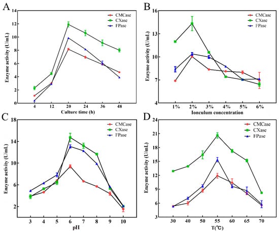 To optimize conditions for cellulase production using DC-11, its growth curve was first plotted. This strain reached the logarithmic growth phase at 8–16 h after inoculation, and its growth plateaued after 20 h (Figure 4D). The results showed that incubation time, inoculum concentration, temperature, and pH had significant effects (p < 0.05) on cellulase production (Figure 5). The effect of incubation time on cellulase activity is illustrated in Figure 5A. As the culture time increased, the cellulase activity first increased and then decreased. When the culture time was 20 h, activities of the CMCase, CXase, and FPase peaked at 8.16, 11.91, and 9.86 U/mL, respectively. The effect of the inoculum concentration of DC-11 on cellulase activity also showed a trend of first increasing and then decreasing. Maximum degradation of cellulose occurred when the inoculum concentration was 2%, at which the CMCase, CXase, and FPase activities reached 10.03, 14.34, and 10.38 U/mL, respectively (Figure 5B). Optimum pH and temperature are key factors for cellulase production. The enzyme production curve of strain DC-11 at various initial pH values is shown in Figure 5C. All three cellulase activities reached their maximum at pH 6; at this pH, the CMCase, CXase, and FPase activities reached 8.95, 14.88, and 12.97 U/mL, respectively. The results indicated that the optimum pH of DC-11 for cellulase production was 6. Furthermore, all three cellulases remained highly active over a broad range of pH values (from 4.0 to 9.0). The effect of different temperatures on the enzymatic activity was evaluated at the optimum pH, incubation time, and inoculum concentration, the results of which are presented in Figure 5D. Strain DC-11 was able to tolerate the temperature range of 30–70 °C. The optimum temperature for the production of cellulase by DC-11 was 55 °C, which indicates that DC-11 is a thermophilic cellulolytic bacterium. At the optimum inoculum concentration, pH, and temperature, the activities of CMCase, CXase, and FPase reached up to 11.91, 20.61, and 15.40 U/mL, respectively.