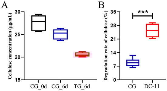 Unpretreated silkworm excrement was treated with DC-11, and the cellulose degradation rate was monitored for a period of 6 days, as shown in Figure 6A. On day 0, the cellulose concentration in the silkworm excrement was 18.51 μg/mL in CG. After 6 days, the concentrations of cellulose in silkworm excrement in TG and CG were 11.08 and 17.83 μg/mL, respectively. The cellulose degradation rate of TG treated with DC-11 was 39.57%, which was significantly higher than that of CG (10.01%, Figure 6B). These results signify that strain DC-11 can significantly enhance cellulose degradation in silkworm excrement and accelerate the resource utilization of silkworm excrement.