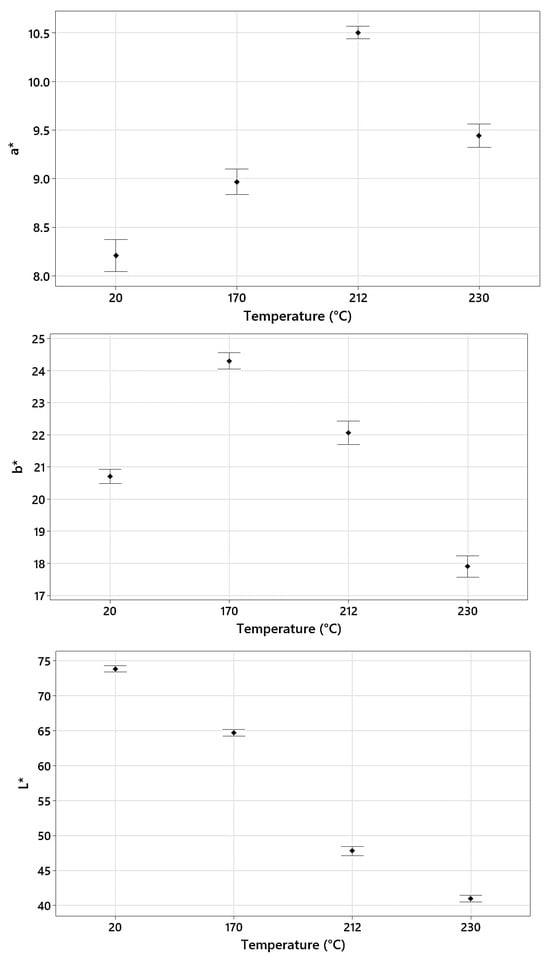 Color analysis (L*, a*, and b*) of the control and heat-treated samples (Figure 3) showed that samples progressively became darker (L*) with rises in the modification temperature. However, the values for a* and b* did not change consistently with heat treatment, i.e., they remained the same with the increasing temperature. Instead, a* peaked at 212 °C and b* at 170 °C before decreasing. The largest difference in L* values was observed between 170 °C and 212 °C, with the L* for the two highest temperatures being most similar (likely explained by the relatively small difference (18 °C) between the two treatment temperatures).