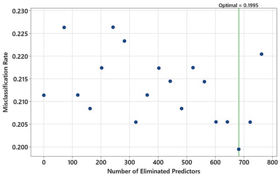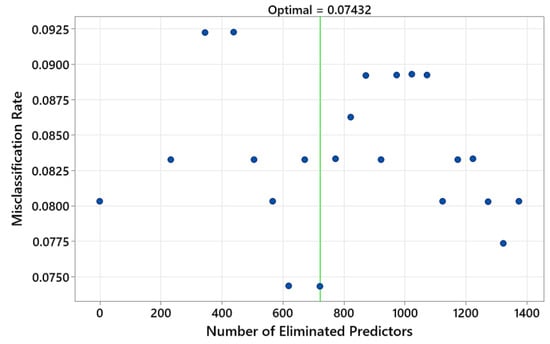 Finally, the TreeNet model was trained with the NIR spectra in the 1700–2500 nm range. Predictor elimination resulted in the model having 119 wavelengths (features) as predictors (Figure 11). The model minimum misclassification rate on the test data was 0.1995.