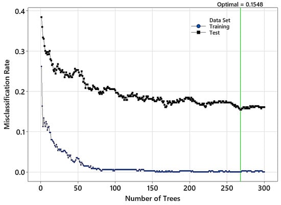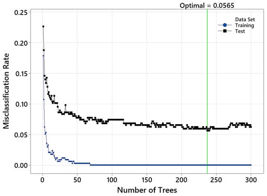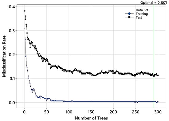 Variation in the misclassification rate versus the number of trees in the TreeNet model. (Input NIR range: 1400–2500 nm).