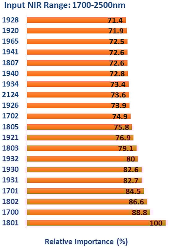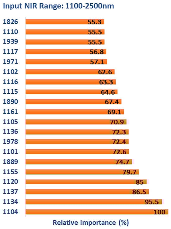 The top 20 wavelengths with the highest relative levels of importance obtained from TreeNet model after multiclass classification (input NIR range: 1100–2500 nm).