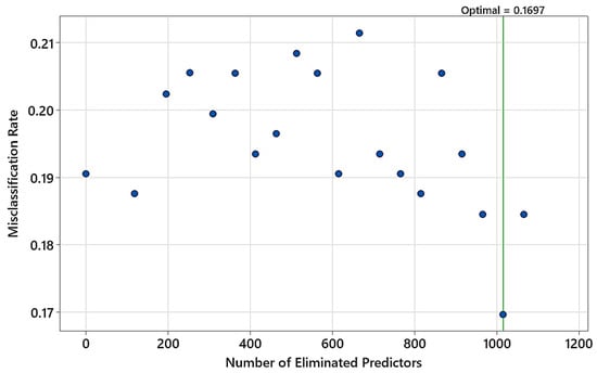 To study the impact of the NIR spectrum range on the performance of the TreeNet model, and how it may impact wavelength selection by the machine learning model, the spectral range was limited to 1400–2500 nm for multiclass classification. Predictor elimination resulted in removing more than 1000 wavelengths and leaving only 86 features as predictors (Figure 8). The minimum misclassification rate of the model was 0.1697 on the test data.