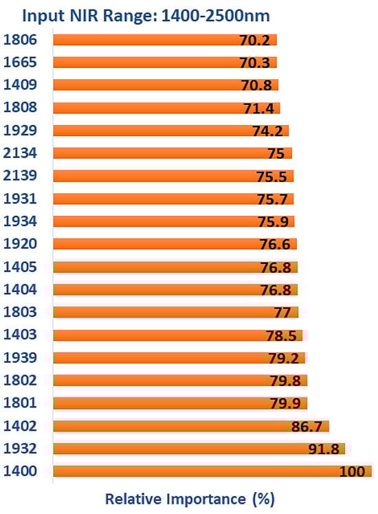 It can be seen that the overall classification accuracy of the model (test data) trained with spectra in the range of 1400–2500 nm (89.29%) is lower than when trained with NIR spectra in the range of 1100–2500 nm (94.35%), indicating the importance of features (reflectance shifts related to color changes) in the range of 1100–1200 nm. The important wavelengths contributing to the model performance could explain the weaker classification. Analyzing the critical features indicates that all of the 86 input wavelengths were considered essential and contributed positively to the model’s performance. Figure 10 lists the top 20 wavelengths with the highest relative levels of importance obtained from TreeNet after multiclass classification. Limiting the wavelength range saw features that were associated with either water or wood chemistry being utilized. Six of the water-related features occurred in the region of 1920–1934 nm, and six in the region of 1400–1409 nm (1414 nm = water). The region of 1400–1409 nm is also related to wood chemistry (1410 nm = lignin/extractives). Other chemistry-related features included 1665 nm (hemicellulose 1st OT C-H stretch (1666 nm) or extractives 1st OT Car-H stretch (1668 nm)), five in the range of 1801–1806 nm (1793 nm = cellulose 1st OT O-H stretch, 1811 nm = lignin) and 2134/2139 nm (2134 nm = hemicellulose tentatively assigned to C-H stretch + C=O stretch and lignin/extractives Car-H stretch + C=O stretch).