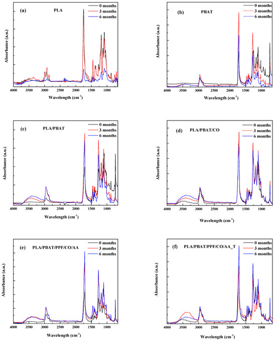 FTIR spectra of (a) PLA, (b) PBAT, (c) PLA/PBAT, (d) PLA/PBAT/CO, (e) PLA/PBAT/PPF/CO/AA, (f) PLA/PBAT/PPF/CO/AA_T.