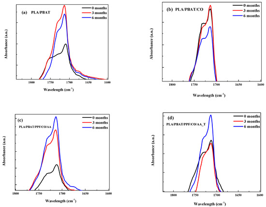Detailed FTIR spectra of (a) PLA/PBAT, (b) PLA/PBAT/CO, (c) PLA/PBAT/PPF/CO/AA, (d) PLA/PBAT/PPF/CO/AA_T at 1740 cm−1.