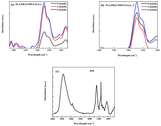 Detailed FTIR spectra of (a) PLA/PBAT/PPF/CO/AA, (b) PLA/PBAT/PPF/CO/AA_T, and (c) PPF at 1269 cm−1.