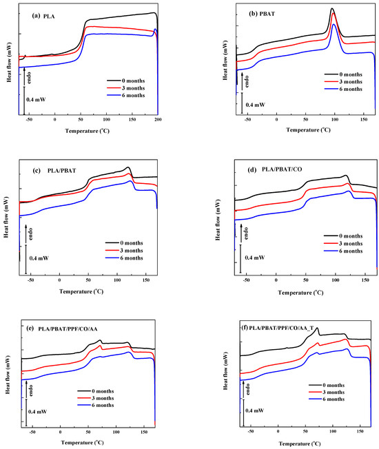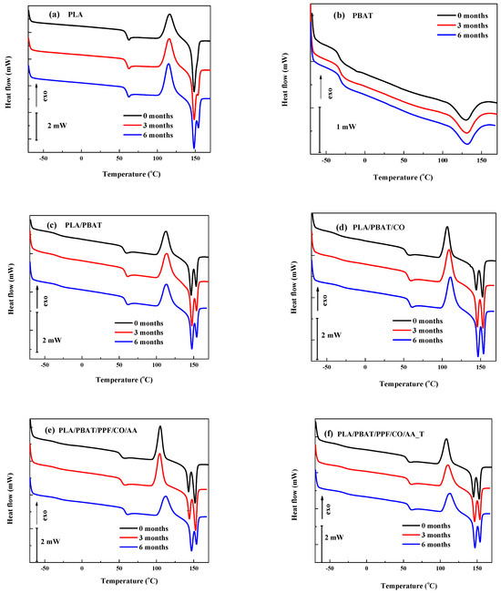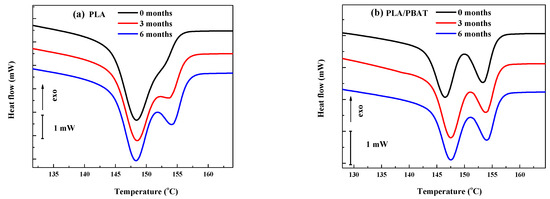 The thermal behavior of the PLA component in the PLA/PBAT blend (Figure 6c) is slightly different when compared to that of neat PLA, as shown in Figure 7a,b. Both Tg and Tm decreased by 4 and 1.9 °C, respectively, and a higher melting temperature (153.2 °C) developed. These findings suggest the interaction between PLA and PBAT in the blend. Additionally, both the Tg and Tm values increased with degradation time: 56.5, 58.7 and 59.1 °C and 146.5, 147.5 and 147.5 °C initially and after 3 and 6 months, respectively, and approached those of neat PLA. This result can be interpreted as the selective degradation of either or both PBAT or PBAT-altered PLA regions.