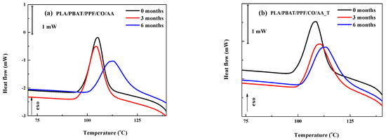 The detail of Figure 8a shows that for the PLA/PBAT/PPF/CO/AA blend, a similar Tcc value was obtained for the initial fiber and after 3 months of degradation (105.0 °C and 104.3 °C, respectively). After 6 months of degradation, this value increased by 8.5 °C (112.6 °C). For the PLA/PBAT/PPF/CO/AA_T fiber, there was a displacement of Tcc to higher values from 108.5 °C (initial) to 110.5 °C (3 months) and 113.2 °C (6 months). As seen in Figure 8b, after degradation, a similar Tcc value was reached after both 3 and 6 months. This could be related to the adhesion or uniform dispersion of the PPF with the use of temperature in the emulsion limiting the blend’s segmental motion [43,44].
