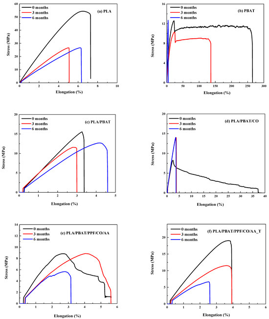 Stress–strain curves for (a) PLA, (b) PBAT, (c) PLA/PBAT, (d) PLA/PBAT/CO, (e) PLA/PBAT/PPF/CO/AA, and (f) PLA/PBAT/PPF/CO/AA_T before and after degradation.