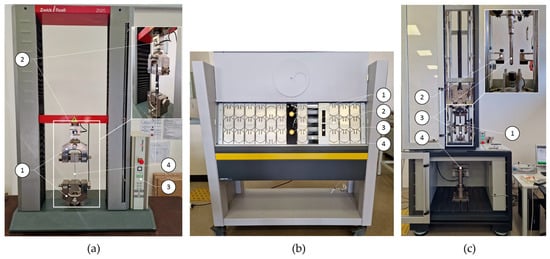 Testing equipment. (a) Universal testing machine Zwick/Roell Z020: 1—specimen-holding clamps “GRIPS”; 2—20 kN force cell; 3—machine controller; 4—specimen. (b) UV-aging chamber Atlas UVTest: 1—UV sensors; 2—specimen holder; 3—specimen; 4—UV lamp. (c) Drop-weight-testing machine Zwick/Roell Amsler HIT200F: 1—variable weight carriage; 2—safety pins; 3—puncture probe; 4—pneumatic specimen holding grips.