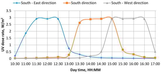 UV irradiation. The amount of UV energy in sunlight under real-world conditions was estimated and compared. UV measurements were taken on June 17 2020 on a sunny day with no clouds. The measurements were taken from 10:30 to 17:00 in three directions—southeast, south, and southwest—with the instrument tilted 45° towards the sky from the horizon. The geographical coordinates of the UV measurement location were 55.7274° latitude and 21.1260° longitude. The UV dose rate was measured using a UV test calibration radiometer UVA at 351 nm, and a one-day graph is shown in Figure 2.