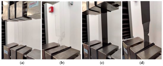 Tensile tests of non-aged virgin A-PET and recycled R_A-PET specimens: (a) non-aged virgin A-PET specimen before test; (b) non-aged virgin A-PET specimen after test; (c) recycled R_A-PET specimen before test; (d) recycled R_A-PET specimen after test.