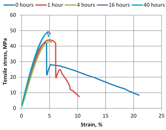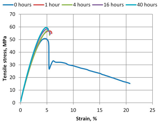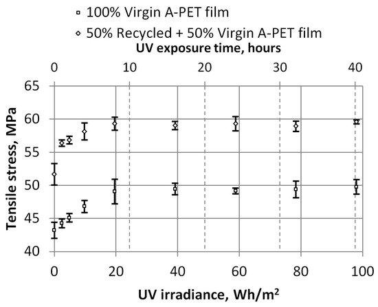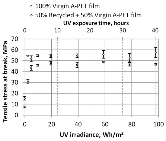 The breaking point of the specimens also clearly demonstrates the impact of UV aging on A-PET material. The tensile stress of the breaking point of the recycled materials increased from 15.5 Mpa to an average value of 54.43 Mpa after just 1 h of UV exposure (4.9 Wh/m2) and remained similar even after prolonged aging (Figure 10).