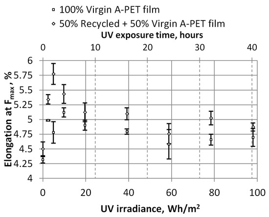 The dependencies of tensile strength and strain at maximum force on UV irradiance are shown in Figure 8 and Figure 9, respectively. These dependencies show that the tensile strength of R_A-PET films is 20% higher than that of virgin films. After more than 8 h of UV exposure (or 19.6 Wh/m2), the tensile strength does not change; it remains almost the same; i.e., the R_A-PET films are about 59.2 MPa and the virgin A-PET films are about 49.4 Mpa. The relative elongation (strain) of maximum tensile strength films also has a limiting UV aging time. Figure 9 shows that after UV aging for 1–4 h (up to 9.8 Wh/m2), the relative elongation of films increases, but when they are UV-aged for more time, their relative elongation begins to decrease, the material becomes harder, and its plasticity decreases. In graphs, error bars indicate the standard deviation of the measurements and show how the set of experimental results tend to be close to the mean.