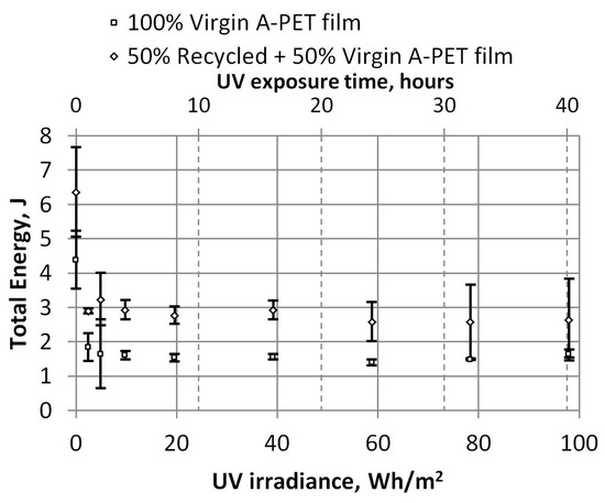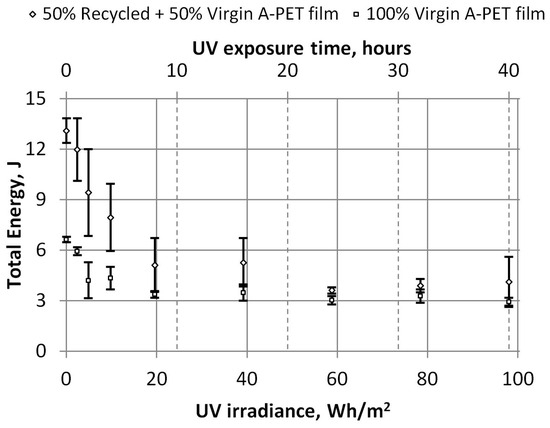Dependence of UV irradiation on the total energy consumed to break A-PET films.