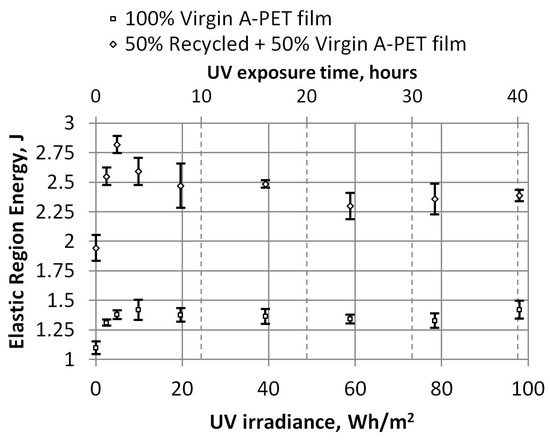 Two types of A-PET films were analyzed: A-PET (pure virgin material) and R_A-PET (50% recycled and 50% virgin material). The films were aged in a UV chamber for 1 to 40 h; in other words, up to 98 Wh/m2 dose, with 2.45 W/m2 irradiation intensity. The results confirmed the significant impact of UV on the mechanical properties of the films, particularly in the case of the R_A-PET material. The degradation of the properties was best demonstrated by the calculated work required for elastic and plastic deformations. It was found that exposing the A-PET film to UV light for just 1–2 h (up to 5 Wh/m2 under 2.45 W/m2 irradiation intensity) caused a significant loss of its plasticity properties. Thus, films used in the thermoforming of packaging should be protected from direct sunlight.