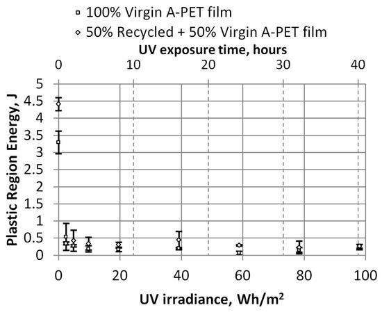 Puncture impact test results showed that the examined PET films are extremely sensitive to photodegradation under UV exposure. By contrast, virgin PET is bit less sensitive; it shows 50% of the fracture energy decrement after the first 8 h of artificial UV exposure in a UV aging chamber, and its approximately 20 Wh/m2 semi recycled PET film, marked R_A-PET, shows higher sensitivity to UV irradiation (after the same exposure, fracture energy decreased by 60%).