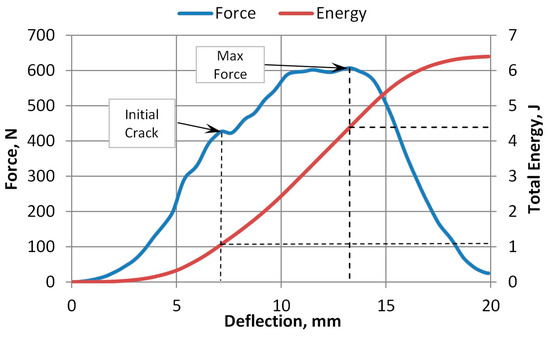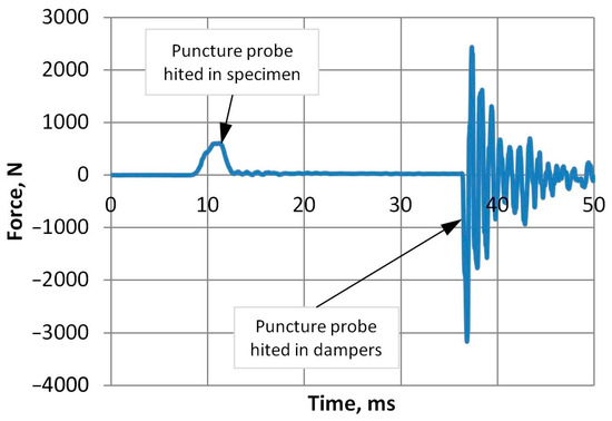 Puncture impact tests were performed to determine the nature of fracture during impact, which can be either ductile or brittle. The Zwick/Roell drop weight tester recorded the force during the short impact process, as shown in Figure 15. The force–time graphs reveal the first part of the impact, i.e., when the puncture probe hits the specimen. The magnitudes of force and deflection were calculated to determine the energy required to penetrate A-PET film specimens.