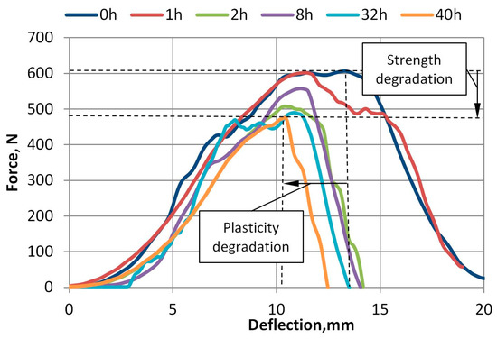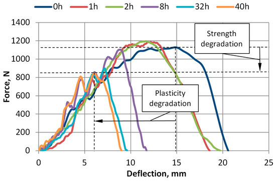 Force versus deflection plots after UV aging of 100% virgin A-PET films.