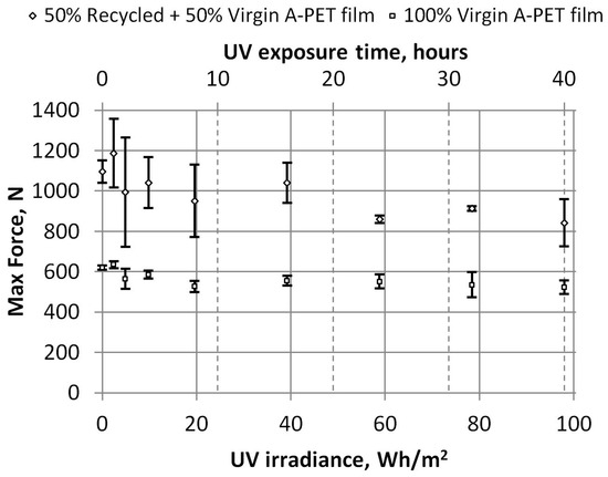Puncture resistance is a measure of the maximum force or energy required to penetrate an A-PET film. Almost twice as much force is needed to penetrate R_A-PET films compared to 100% virgin films (about 1150 N and 630 N for unaged films, respectively). In Figure 19, we can see maximum force decreases by about 15–25% when the UV irradiance reaches 98 Wh/m2 (or after 40 h of accelerated UV aging).