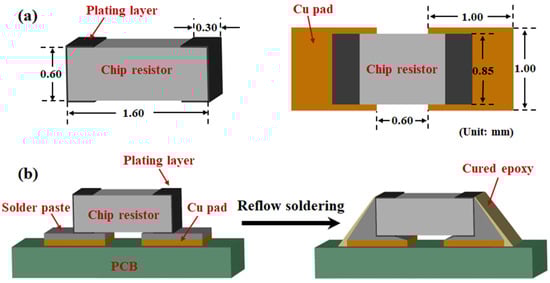 Schematic diagram of (a) dimensions of the chip resistor and Cu pad and (b) the preparation process of epoxy composite solder joint during the reflow soldering.