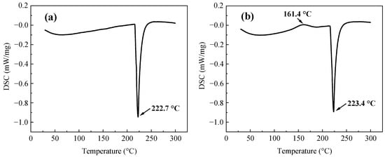 Figure 2 shows the DSC curves of the thermal behaviors of the monolithic SAC305 and SAC305-8ER solder pastes. It can be seen from Figure 2a that there was an obvious endothermic peak at 222.7 °C, corresponding to the melting characteristics of the SAC305 solder alloy. For the SAC305-8ER solder paste, the liquid peak of the solder alloy was 223.4 °C, which was nearly identical to the monolithic solder paste. In addition, an exothermic peak was detected before the melting of the solder alloy in Figure 2b, which indicated the curing behavior of the added epoxy resin. However, the heating rate during reflow soldering is significantly higher than that of the DSC test, and thus the peak temperature of the curing reaction will be increased, while the melting temperature of solder alloy is almost constant [31].