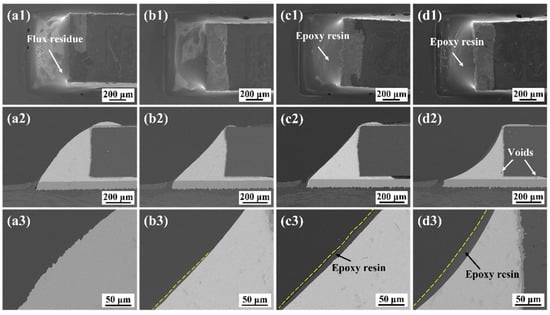 Figure 3 reveals the macroscopic morphologies and microstructure of the as-reflowed monolithic SAC305 and epoxy composite SAC305 solder joints. It can be seen that an excellent metallurgical connection was established between the 0603 resistor and the Cu pad. During the reflow process, the added epoxy moved to the surface of the molten solder alloy due to its high fluidity and low density and then formed thermoplastic production by a curing reaction. As shown in Figure 3c1, with the addition of 8 wt.% epoxy, it can be observed that a continuous epoxy surrounding layer adhered to the joint surface. However, some voids were generated in the solder matrix if excessive epoxy was added, as shown in Figure 3d2. The void formation can be attributed to the organics residue that failed to evacuate from the solder matrix during the reflow process.