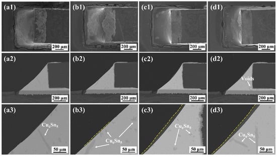 SEM images of the solder joints after reflow soldering: (a1–a3) monolithic SAC305; (b1–b3) SAC305-4ER; (c1–c3) SAC305-8ER; (d1–d3) SAC305-12ER.