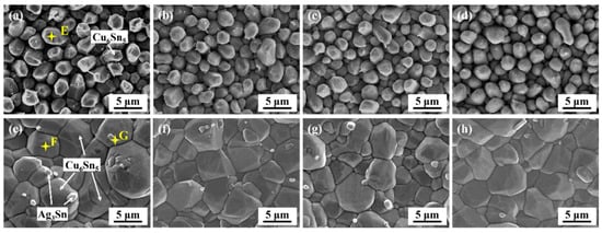 Top-view images of interfacial IMCs of the joints after aging for (a–d) 0h and (e–h) 1000 h: (a,e) monolithic SAC305; (b,f) SAC305-4ER; (c,g) SAC305-8ER; (d,h) SAC305-12ER.