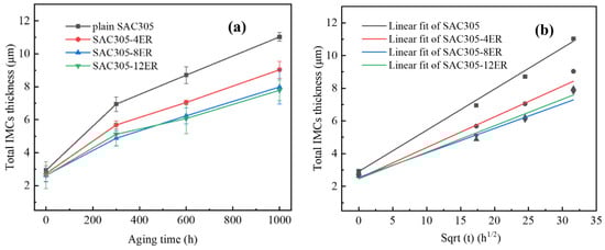 Figure 7a illustrates the total thickness variation of the interfacial layer of the monolithic SAC305 and epoxy composite SAC305 solder joints for various aging times. It is evident that, as the aging time increased, the total thickness of all the aged joints showed a significant increase. After undergoing a 1000 h aging process, the interfacial layer of the monolithic SAC305 solder joint exhibited the highest thickness of 11.03 μm, while those solder joints bearing 4, 8 and 12 wt.% epoxy resins had thinner IMC thicknesses, with 9.03 μm, 7.99 μm and 7.79 μm, respectively.