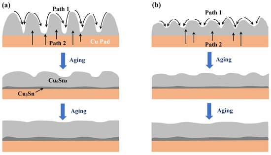 In the subsequent solid-state aging, the Cu6Sn5 gradually thickened because of the continuous diffusion of Cu and Sn atoms. It has previously been mentioned that, at room temperature or during solid-state thermal aging, Cu can move into Sn and Cu6Sn5 IMC by interstitial diffusion, which is easier than the movement of Sn to Cu, dominated by lattice diffusion [41]. As illustrated in Figure 8, the Cu flux engaged in the interfacial reaction primarily originated from two parts. Firstly, the Cu flux from the scallop peak to the valley (Path 1) was propelled by the curvature effect to reduce the surface energy of the scallop-like interfacial IMCs. The other is the Cu diffusion flux from the Cu substrate (Path 2) [42]. The transformation of morphology from scallop type to layer type can be attributed to the short diffusion path existing between the scallop valley and the Cu pad. Compared with the epoxy composite joints, the interfacial layer of the monolithic joint was more uneven and thus thickened rapidly at the valley in the subsequent aging. Therefore, although the thickness of the as-soldered joints was similar, the interfacial IMC growth of the monolithic joint was faster. This phenomenon was more pronounced for the joints with higher epoxy content. Deng et al. [43] investigated the influence of the initial morphology and thickness of the interfacial layers on the IMC growth of Sn-Ag/Cu joints during isothermal aging. It was also pointed out that, due to the shorter diffusion path in the scallop valleys, the joint with a scallop-like IMC layer had a higher IMC growth rate during aging compared to the joint with a flat interfacial IMC layer.