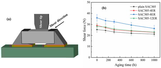 (a) Schematic diagram of shear test; (b) shear forces of monolithic SAC305 and epoxy composite SAC305 solder joints during thermal aging.