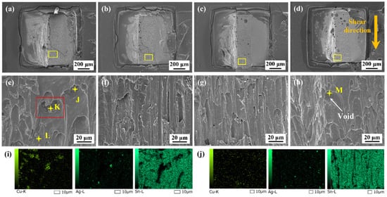 Fracture morphologies of the joints aged for 1000 h: (a) monolithic SAC305; (b) SAC305-4ER; (c) SAC305-8ER; (d) SAC305-12ER; (e) enlarged image of the marked region in (a); (f) enlarged image of the marked region in (b); (g) enlarged image of the marked region in (c); (h) enlarged image of the marked region in (d); (i) EDS element mapping of (e); (j) EDS element mapping of (g).